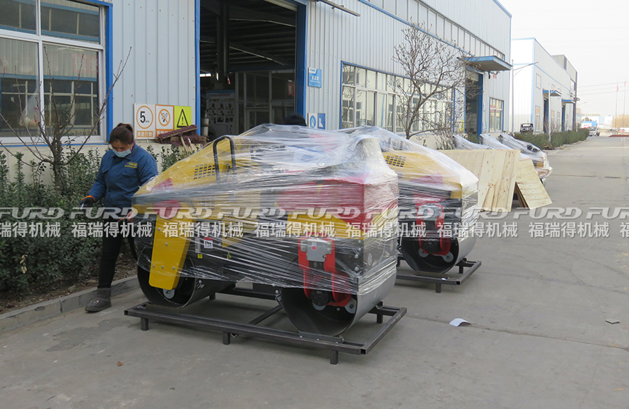 1月18日,福瑞得機械3臺手扶雙輪壓路機和兩臺座駕壓路機打包裝箱出口新加坡。